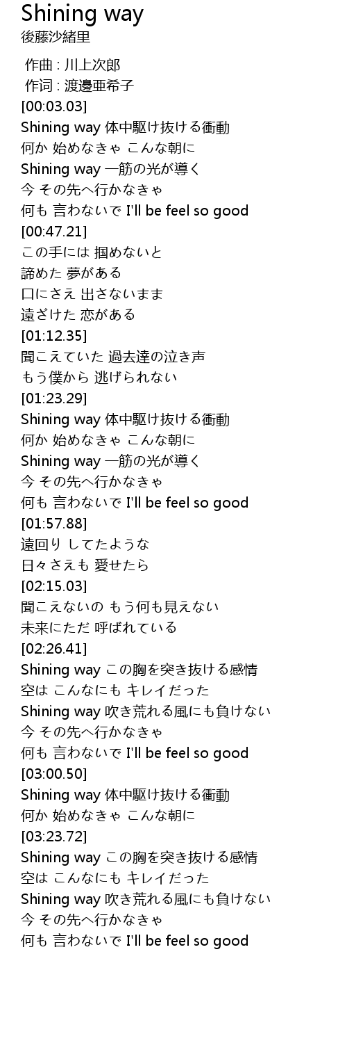 | [03:23.87] | Shining way この胸を突き抜ける感情 |