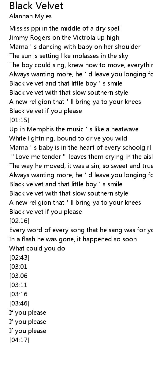 | [03:27][03:06] | Black velvet with that slow southern style |