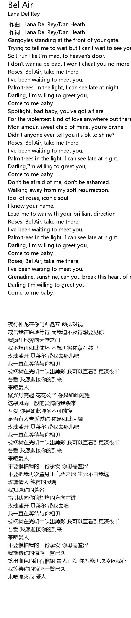 | [00:53.32] | Roses, Bel Air, take me there, |