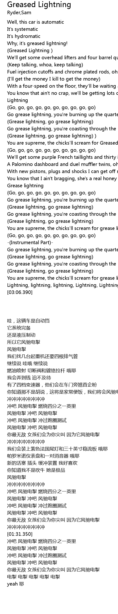 | [00:34.800] | Go grease lightning, you're burning up the quarter mile |
