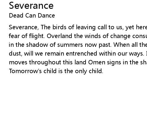 | Severance, The birds of leaving call to us, yet here we stand endowed with the fear of flight. Overland the winds of change consume the land, while we remain in the shadow of summers now past. When all the leaves have fallen and turned to dust, will we remain entrenched within our ways. Indifference, the plague that moves throughout this land Omen signs in the shapes of things to come. Tomorrow's child is the only child. |