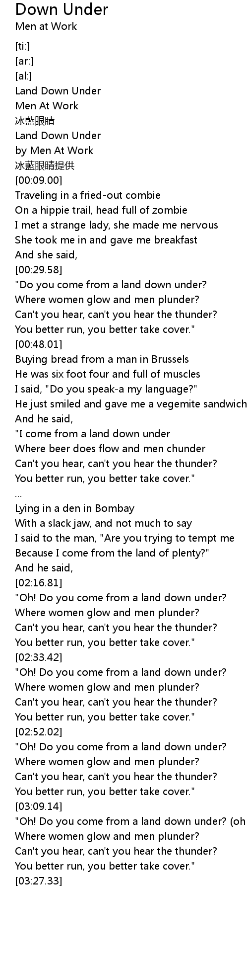 | [00:01.00] | Land Down Under |