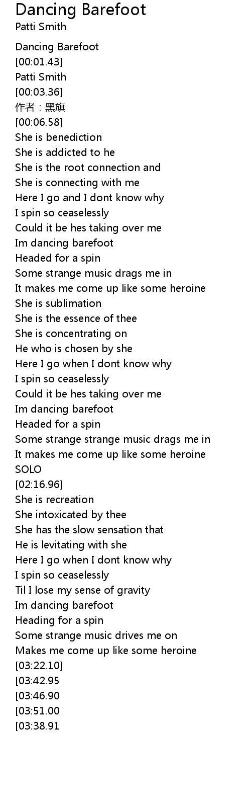 | [00:00.46] | Dancing Barefoot |