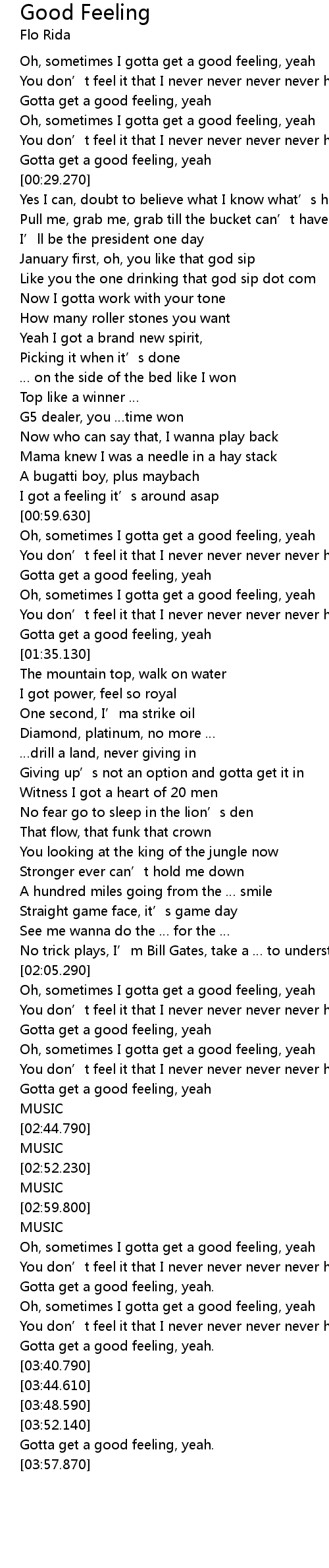 | [03:10.870] | Oh, sometimes I gotta get a good feeling, yeah |