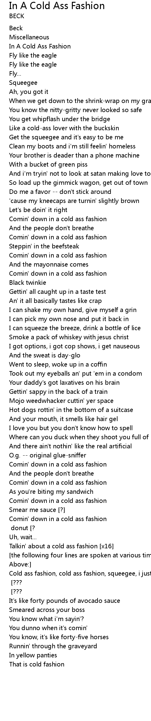 Cold ass fashion, cold ass fashion, squeegee, i just took some acid (?) |