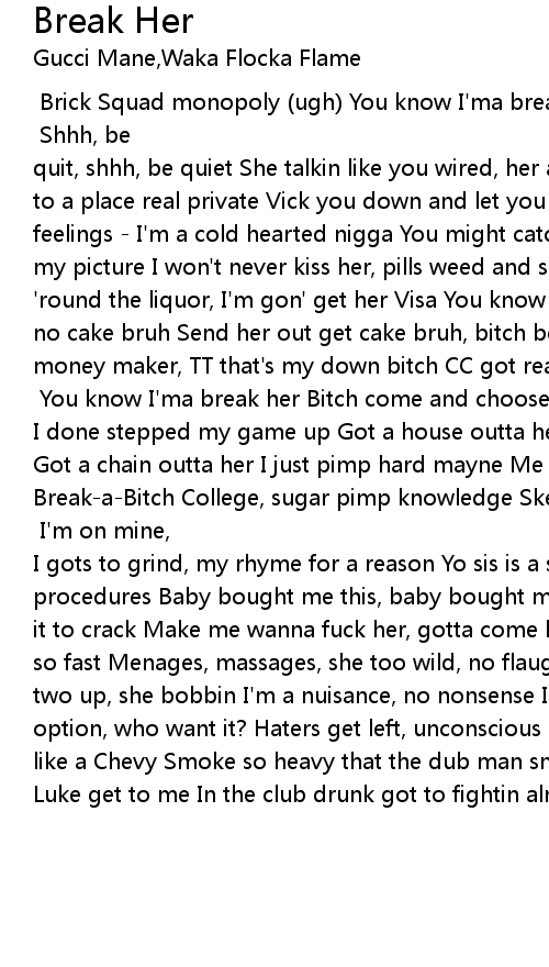 [Intro] Brick Squad monopoly (ugh) You know I'ma break her Bitch come and choose up! I just be on hard mayne Me and old Gucci Mane [Waka Flocka Flame] Shhh, be quit, shhh, be quiet She talkin like you wired, her ass think she hired Take you to a place real private Vick you down and let you suck my private I have no feelings - I'm a cold hearted nigga You might catch me wit'cha sister, autograph my picture I won't never kiss her, pills weed and some liquor He might fuck 'round the liquor, I'm gon' get her Visa You know I'ma break her, I don't hear no cake bruh Send her out get cake bruh, bitch be back by 8 uhh Sunshine my money maker, TT that's my down bitch CC got real loose from that, you would give shawty a stupid check [Chorus] You know I'ma break her Bitch come and choose up! I done stepped my game up Got a house outta her She done bought me rings bruh Got a chain outta her I just pimp hard mayne Me and old Gucci Mane [Gucci Mane] Break-a-Bitch College, sugar pimp knowledge Skeet in her mouth and the bitch just swallowed Give her guidelines and the slut just followed |