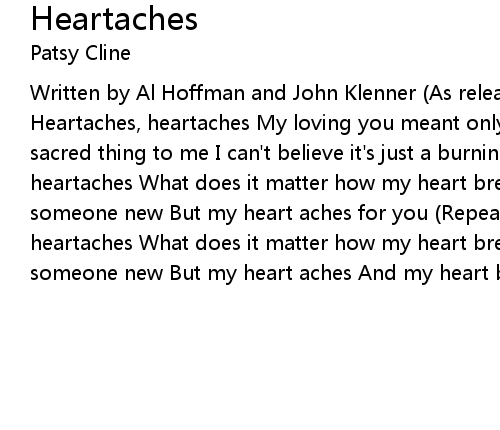 Written by Al Hoffman and John Klenner (As released by Patsy Cline 10/8/62) Heartaches, heartaches My loving you meant only heartaches Your kiss was such a sacred thing to me I can't believe it's just a burning memory Heartaches, heartaches What does it matter how my heart breaks I should be happy with someone new But my heart aches for you (Repeat verse 1 and 2) Heartaches, heartaches What does it matter how my heart breaks I should be happy with someone new But my heart aches And my heart breaks And my heart aches for you |