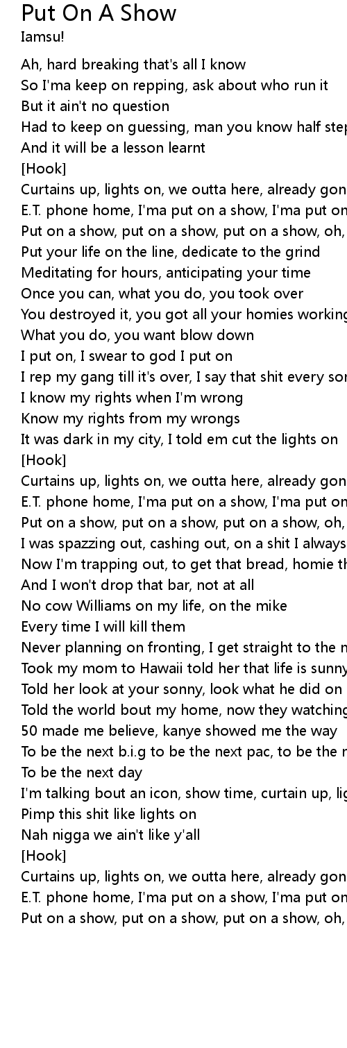 E.T. phone home, I'ma put on a show, I'ma put on a show |