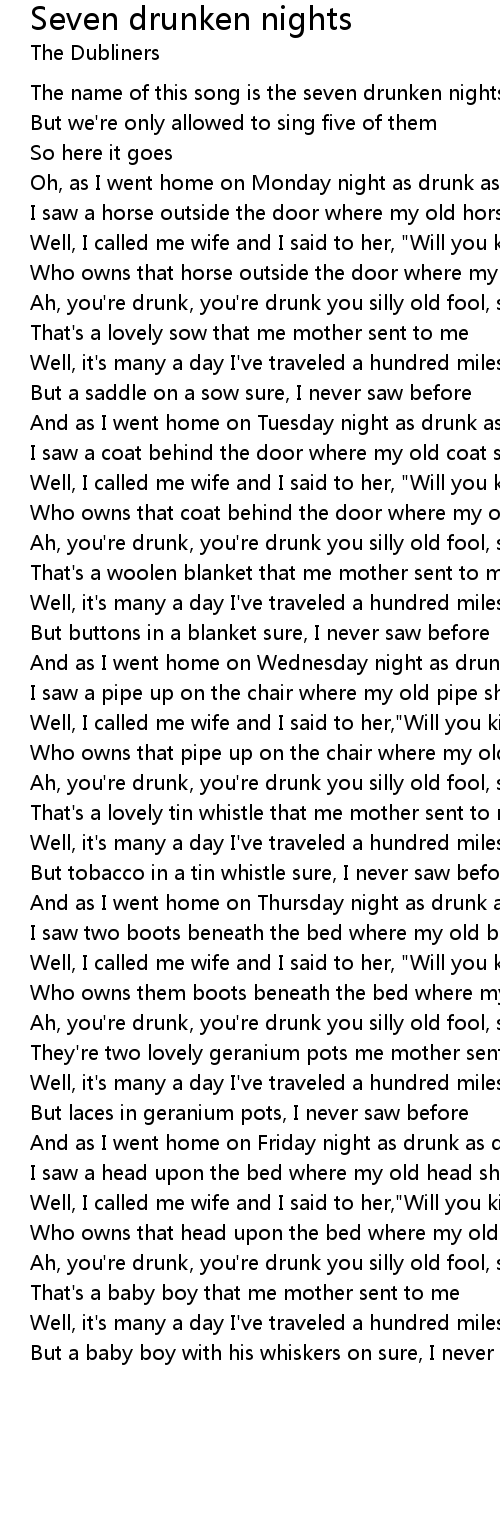 Oh, as I went home on Monday night as drunk as drunk could be |