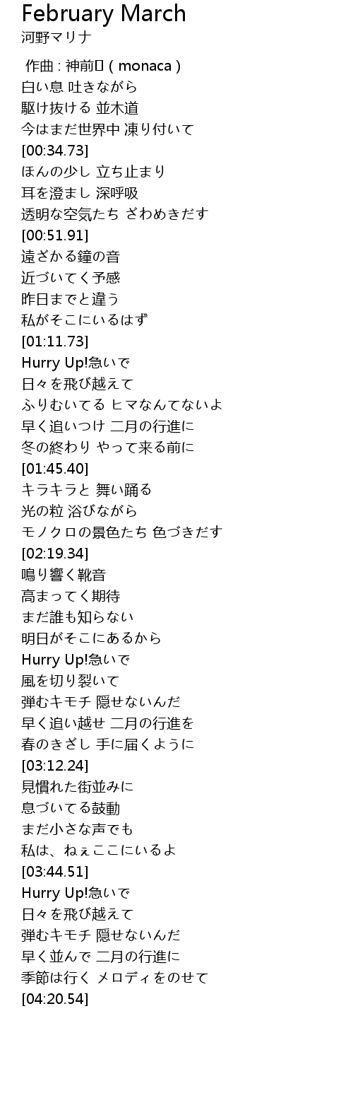 | [02:56.75] | 早く追い越せ 二月の行進を |