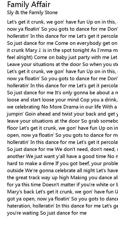 Let's get it crunk, we gon' have fun Up on in this, dance for me We got ya open, now ya floatin' So you gots to dance for me Don't need no hateration, holleratin' In this dance for me Let's get it percolatin', while you're waiting So just dance for me Come on everybody get on up Cause you know we gots to get it crunk Mary J. is in the spot tonight As I'mma make it feel alright (Make it feel alright) Come on baby just party with me Let loose and set your body free Leave your situations at the door So when you step inside jump on the floor Let's get it crunk, we gon' have fun Up on in this, dance for me We got ya open, now ya floatin' So you gots to dance for me Don't need no hateration, holleratin' In this dance for me Let's get it percolatin', while you're waiting So just dance for me It's only gonna be about a matter of time Before you get loose and start loose your mind Cop you a drink, go head and rock your ice Cause we celebrating No More Drama in our life With a great track pumpin', everybody's jumpin' Goin ahead and twist your back and get your body bumpin' I told you leave your situations at the door So grab somebody and get your ass on the dance floor Let's get it crunk, we gon' have fun Up on in this, dance for me We got ya open, now ya floatin' So you gots to dance for me Don't need no hateration, holleratin' In this dance for me Let's get it percolatin', while you're waiting So just dance for me We don't need, don't need, no haters Just try to love one another We just want y'all have a good time No more drama in your life Work real hard to make a dime If you got beef, your problem, not mine Leave all that BS outside We're gonna celebrate all night Let's have fun, tonight, no fights Turn the great track way up high Making you dance all night and I Got some real heat for ya this time Doesn't matter if you're white or black Let's get crunk cuz Mary's back Let's get it crunk, we gon' have fun Up on in this, dance for me We got ya open, now ya floatin' So you gots to dance for me Don't need no hateration, holleratin' In this dance for me Let's get it percolatin', while you're waiting So just dance for me |