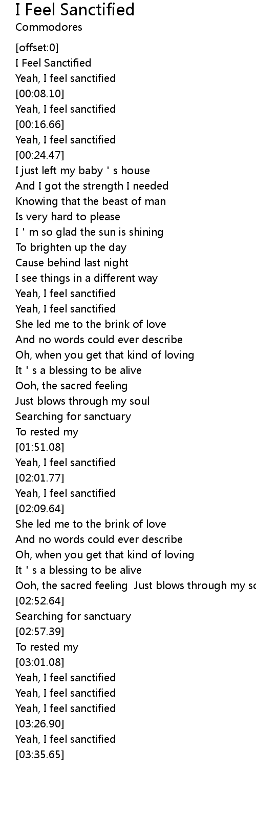 | [00:09.22] | Yeah, I feel sanctified |