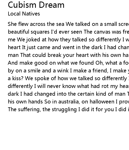 She flew across the sea We talked on a small screen A cubism dream The most beautiful squares I'd ever seen The canvas was free A gift good mother gave to me We joked at how they talked so differently I will never know what had rot my heart It just came and went in the dark I had changed into the certain kind of man That could break your heart with his own hands We were to scan our own towns And make good on what we found Oh, what a fool I was to think That I could get by on a smile and a wink I make a friend, I make you sick Could you even imagine a kiss? We spoke of how we talked so differently I spoke of how I felt so differently I will never know what had rot my heart It just came and went in the dark I had changed into the certain kind of man That could break your heart with his own hands So in australia, on halloween I proved what our love meant to me The suffering, the struggling I did it for you I did it for me |
