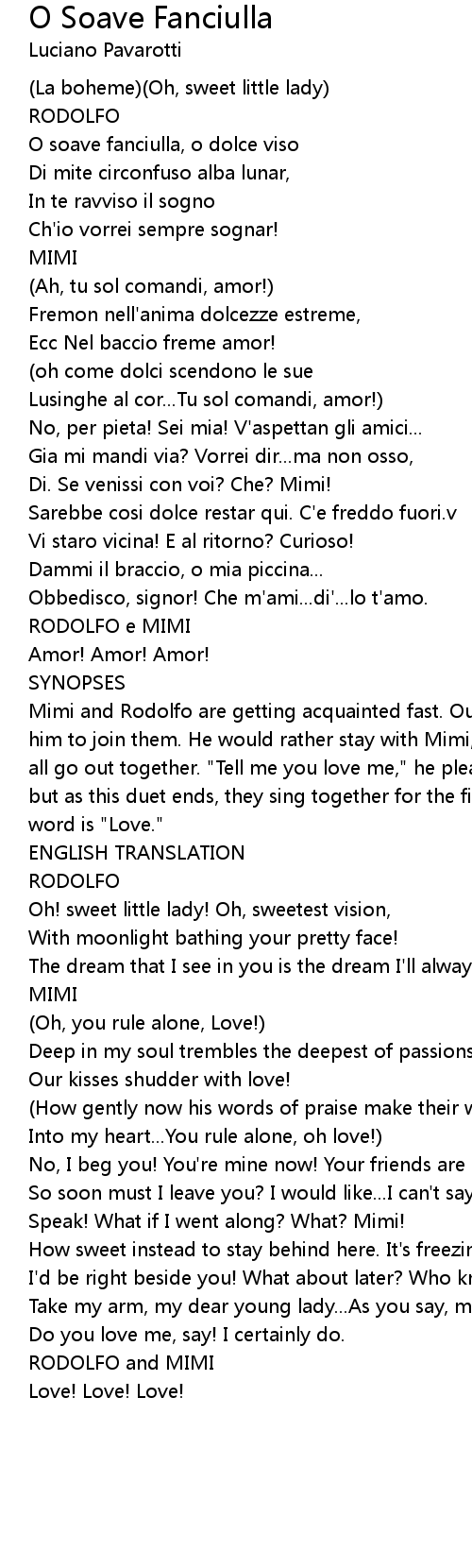 Mimi and Rodolfo are getting acquainted fast. Outside, Rodolfos' friends call him to join them. He would rather stay with Mimi, but she shyly suggests they all go out together. "Tell me you love me," he pleads. She holds back, at first, but as this duet ends, they sing together for the first time, and their first word is "Love." |