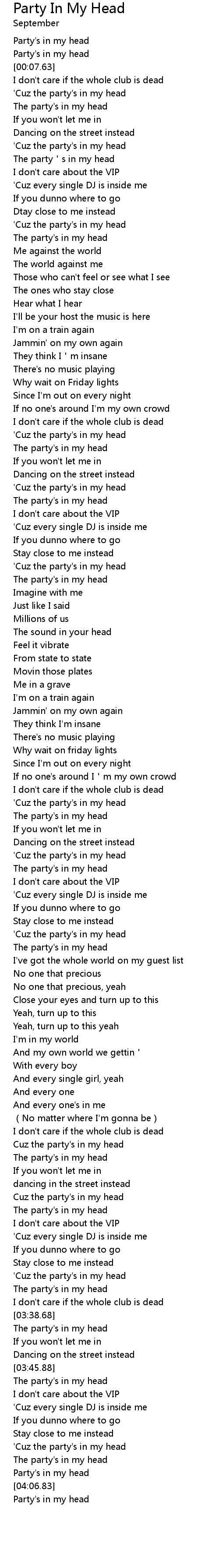 | [04:00.64] | ' Cuz the party' s in my head |