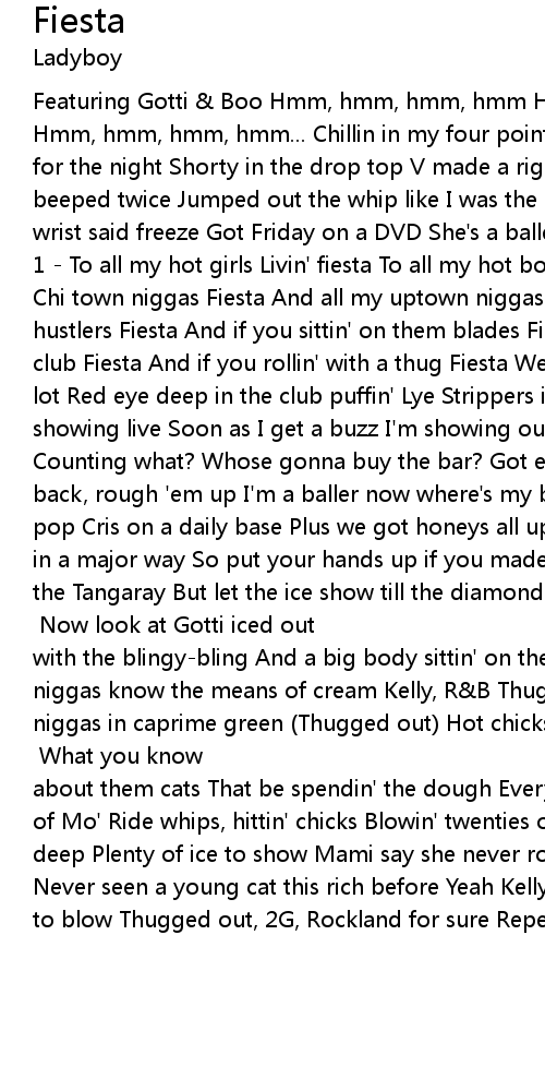 Featuring Gotti & Boo Hmm, hmm, hmm, hmm Hmm, hmm, hmm, hmm Hmm, hmm, hmm, hmm Hmm, hmm, hmm, hmm... Chillin in my four point six at the light Bout to be VIP for the night Shorty in the drop top V made a right Pull up to her bumper baby, beeped twice Jumped out the whip like I was the police Didn't have a gun, but my wrist said freeze Got Friday on a DVD She's a baller and I'm a baller Wha-what? 1 - To all my hot girls Livin' fiesta To all my hot boys Livin' fiesta To all my Chi town niggas Fiesta And all my uptown niggas Fiesta To all my players and my hustlers Fiesta And if you sittin' on them blades Fiesta To all my honeys in the club Fiesta And if you rollin' with a thug Fiesta We be off in the club sippin lot Red eye deep in the club puffin' Lye Strippers in the back of the club showing live Soon as I get a buzz I'm showing out House on top of the hill Counting what? Whose gonna buy the bar? Got enough Take the haters out in the back, rough 'em up I'm a baller now where's my ballers? Wha-what? Repeat 1 We pop Cris on a daily base Plus we got honeys all up in the place Bout to wild out in a major way So put your hands up if you made your pay Add a little juice to the Tangaray But let the ice show till the diamond fades Rockland sittin' on Capitol Hill Trackmaster make capital deals [Gotti] Now look at Gotti iced out with the blingy-bling And a big body sittin' on them gleamy things Now Rockland niggas know the means of cream Kelly, R&B Thug and it sings to king Got PJ niggas in caprime green (Thugged out) Hot chicks down to do anything Cop them mo chicks Cop mo bricks, pop mo Cris Ay Kelly drop mo hits [Boo] What you know about them cats That be spendin' the dough Every day drink Henney and a bottle of Mo' Ride whips, hittin' chicks Blowin' twenties on drough To the club thirty deep Plenty of ice to show Mami say she never rolled in a six before (Fiesta) Never seen a young cat this rich before Yeah Kelly made the way for these niggas to blow Thugged out, 2G, Rockland for sure Repeat 1 |