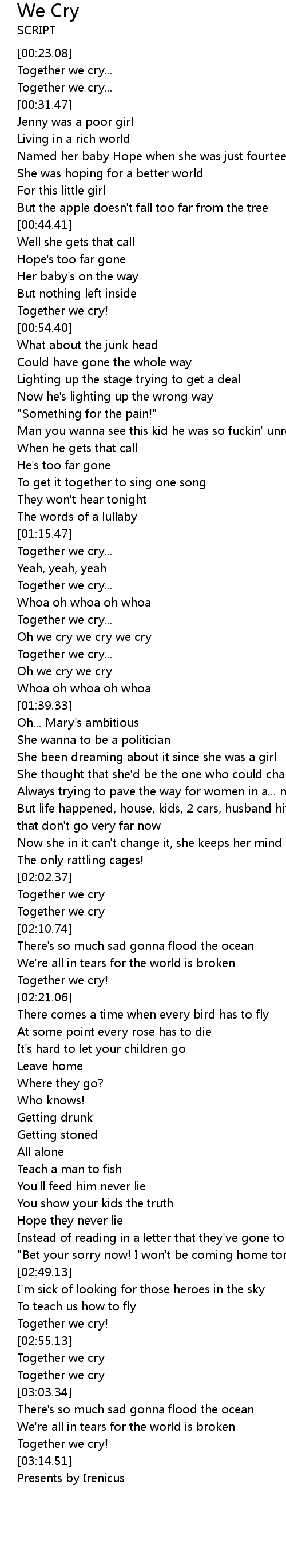 Oh we cry we cry we cry |
