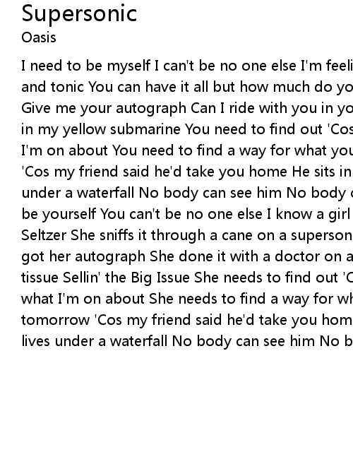 I need to be myself I can't be no one else I'm feeling supersonic Give me gin and tonic You can have it all but how much do you want it? You make me laugh Give me your autograph Can I ride with you in your B.M.W ? You can sail with me in my yellow submarine You need to find out 'Cos no one's gonna tell you what I'm on about You need to find a way for what you want to say But before tomorrow 'Cos my friend said he'd take you home He sits in a corner all alone He lives under a waterfall No body can see him No body can ever hear him call You need to be yourself You can't be no one else I know a girl called Elsa She's into Alka Seltzer She sniffs it through a cane on a supersonic train She made me laugh I got her autograph She done it with a doctor on a helicopter She's sniffin in her tissue Sellin' the Big Issue She needs to find out 'Cos no one's gonna tell you what I'm on about She needs to find a way for what she wants to say But before tomorrow 'Cos my friend said he'd take you home He sits in a corner all alone He lives under a waterfall No body can see him No body can ever hear him call |