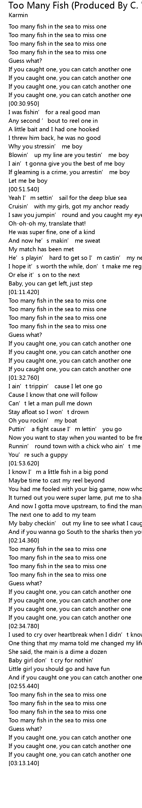 | [03:00.000] | Too many fish in the sea to miss one |