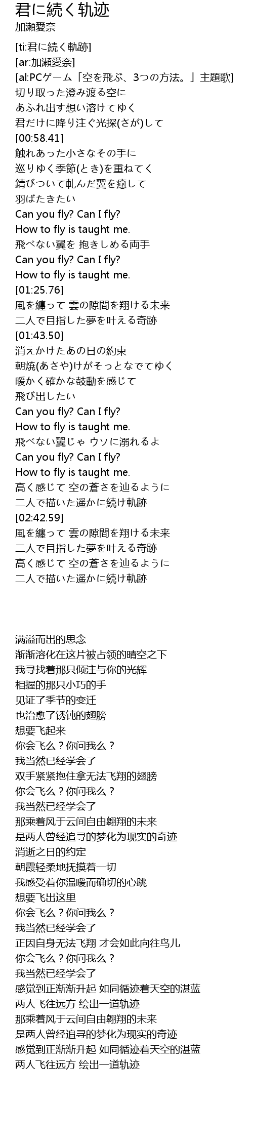 | [02:56.39] | 風を纏って 雲の隙間を翔ける未来 |