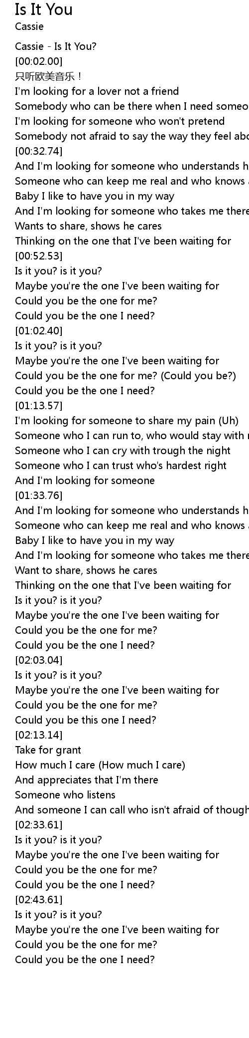 | [00:00.00] | Cassie - Is It You? |