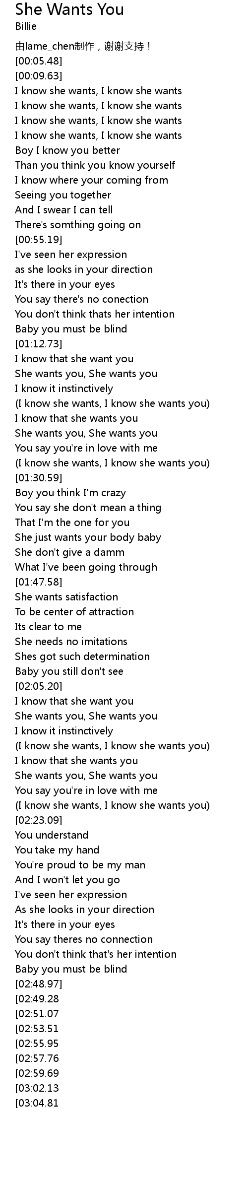| [03:17.44][02:59.69] | She wants you, She wants you |