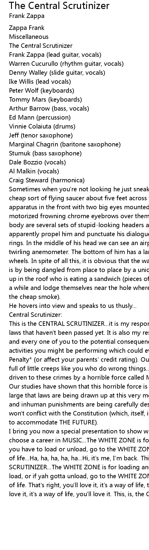 I bring you now a special presentation to show what can happen to you if you choose a career in MUSIC...The WHITE ZONE is for loading and unloading only...if you have to load or unload, go to the WHITE ZONE... you'll love it...it's a way of life...Ha, ha, ha, ha, ha...Hi, it's me, I'm back. This is the CENTRAL SCRUTINIZER...The WHITE ZONE is for loading and unloading only...If yah gotta load, or if yah gotta unload, go to the WHITE ZONE. You'll love it...it's a way of life. That's right, you'll love it, it's a way of life, that's right, you'll love it, it's a way of life, you'll love it. This, is, the CENTRAL SCRUTINIZER! |