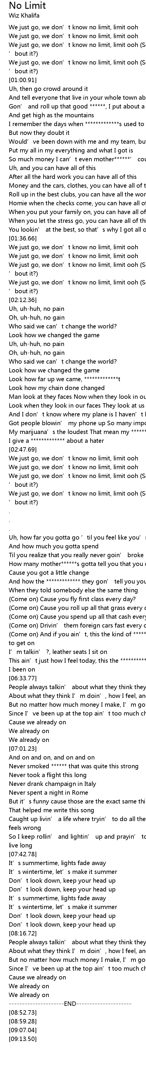 | [02:56.33] | We just go, we don' t know no limit, limit ooh |