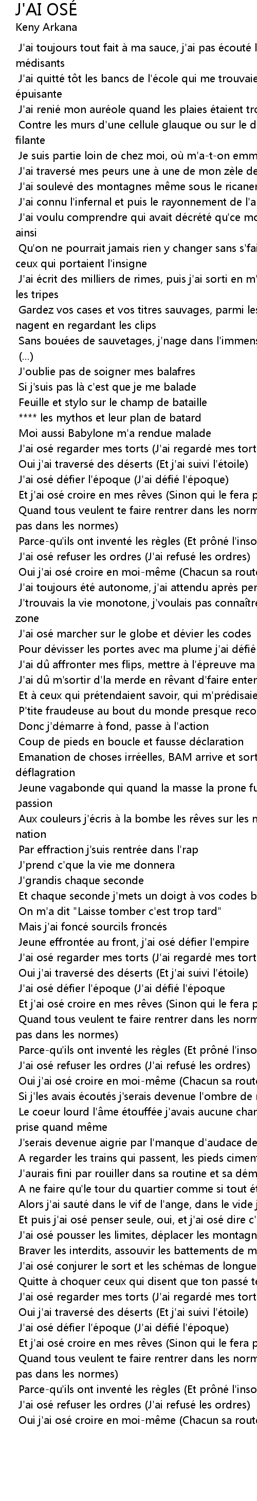 | [02:41.995] | Oui j' ai osé croire en moim me Chacun sa route et sa mission |