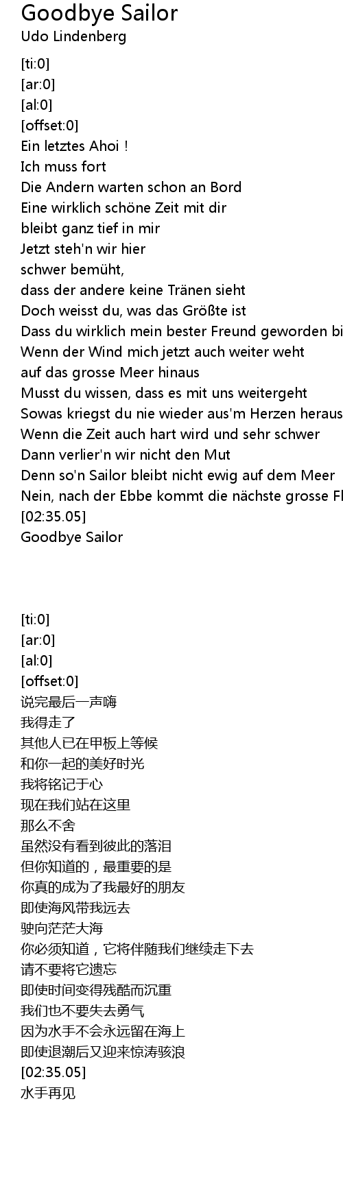| [02:20.56] | Denn so'n Sailor bleibt nicht ewig auf dem Meer |