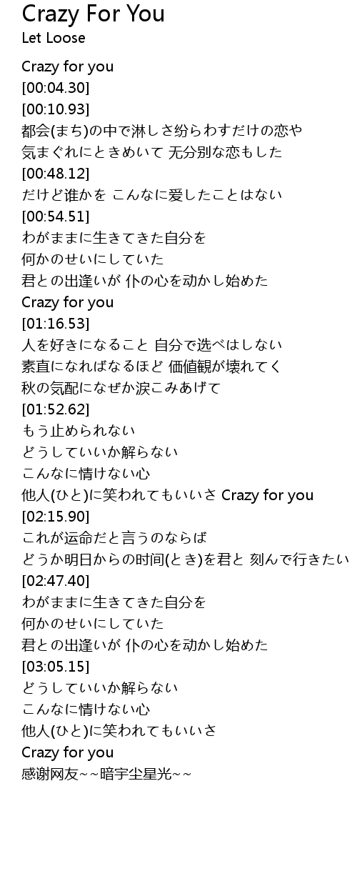 | [02:03.94] | 他人(ひと)に笑われてもいいさ Crazy for you |