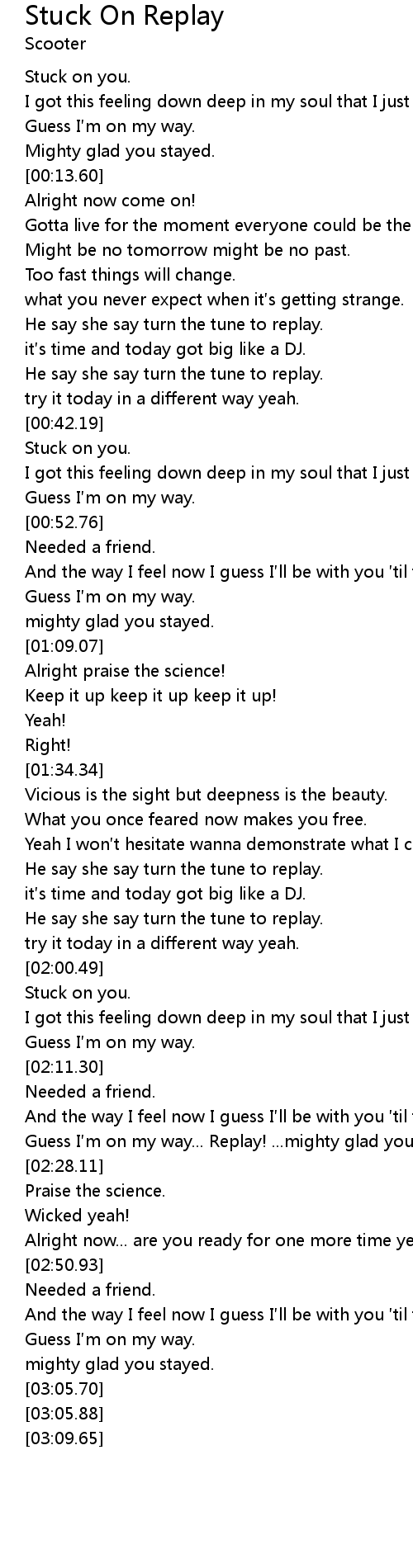 | [02:20.60] | Guess I m on my way... Replay! ... mighty glad you stayed. |
