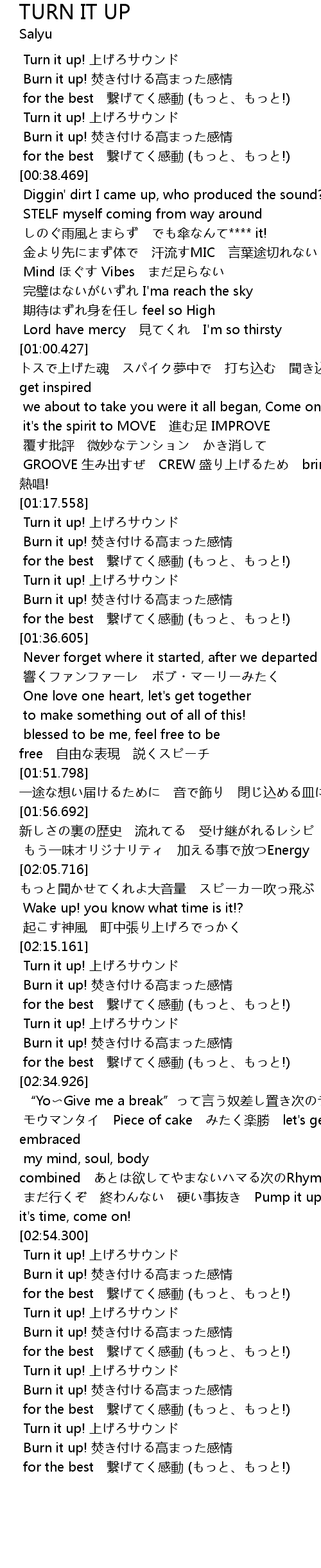 | [03:03.730] | Turn it up! 上げろサウンド |