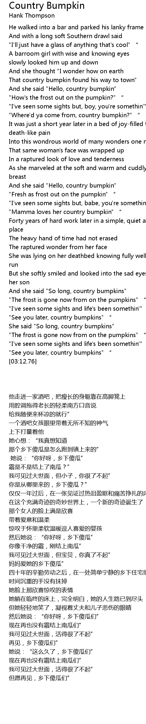 | [00:45.55] | And she said "Hello, country bumpkin" |