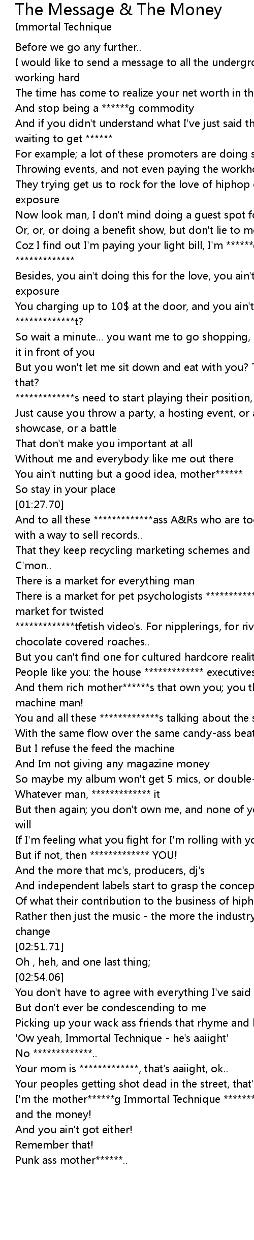 I'm the mother******g Immortal Technique *************! The message and the money! |