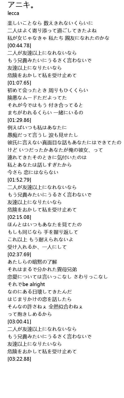 | [02:44.00] | 恋愛については言いっこなし さわりっこなし それでbe alright |