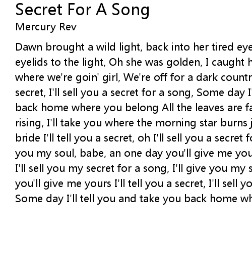 Dawn brought a wild light, back into her tired eyes, Like violets, opening her eyelids to the light, Oh she was golden, I caught her still glowing, I told you where we're goin' girl, We're off for a dark country ride I'll tell you a secret, I'll sell you a secret for a song, Some day I'll tell you and take you back home where you belong All the leaves are falling, Two suns are slowly rising, I'll take you where the morning star burns just for you, My dark country bride I'll tell you a secret, oh I'll sell you a secret for a song, I'll give you my soul, babe, an one day you'll give me yours Oh I'll tell you a secret, I'll sell you my secret for a song, I'll give you my soul, babe, an one day you'll give me yours I'll tell you a secret, I'll sell you my secret for a song, Some day I'll tell you and take you back home where you belong |