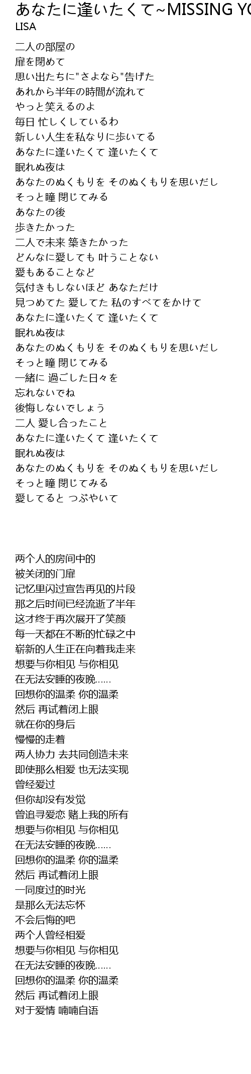 | [01:20.590] | あなたに逢いたくて 逢いたくて |