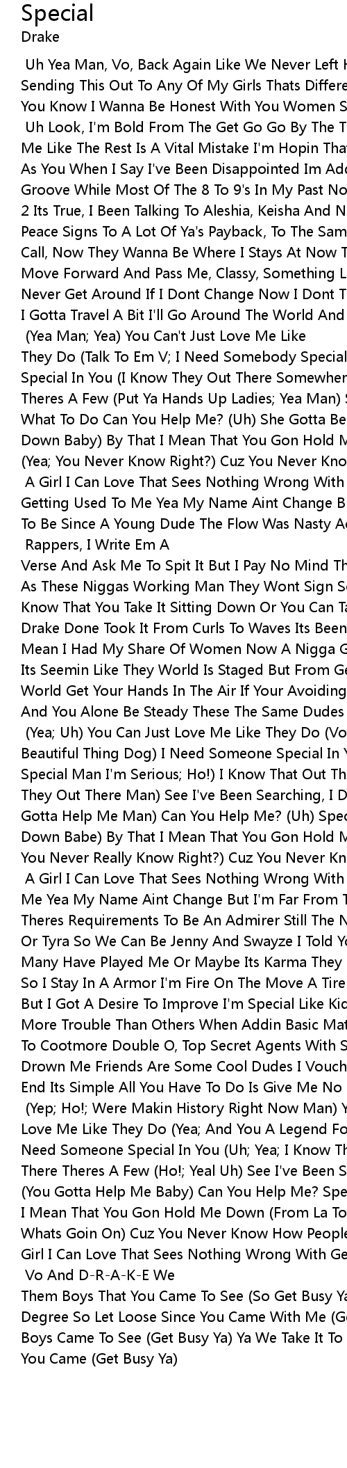 [Drake: Speaking] Uh Yea Man, Vo, Back Again Like We Never Left Huh Yea Man, Im Sending This Out To Any Of My Girls Thats Different Man Anybody Thats Special You Know I Wanna Be Honest With You Women So Ima Start Off Like This [Verse: Drake] Uh Look, I'm Bold From The Get Go Go By The Title Of Drake And Treating Me Like The Rest Is A Vital Mistake I'm Hopin That Aint Nobody Else As Special As You When I Say I've Been Disappointed Im Addressin A Few I Finesse Then I Groove While Most Of The 8 To 9's In My Past Now Get A Rating Thats Less Than A 2 Its True, I Been Talking To Aleshia, Keisha And Nadia And Shadia, Had To Throw Peace Signs To A Lot Of Ya's Payback, To The Same Chicks From Way Back Never Call, Now They Wanna Be Where I Stays At Now They Got The New Boy, I'm Trying To Move Forward And Pass Me, Classy, Something Like Drew Lord A New Me, Cool, See I Never Get Around If I Dont Change Now I Dont Think I'll Ever Settle Down Even If I Gotta Travel A Bit I'll Go Around The World And Back Cuz I Know That Once I Have It Thats It And Uh, [Chorus:] (Yea Man; Yea) You Can't Just Love Me Like They Do (Talk To Em V; I Need Somebody Special In You Girl) I Need Someone Special In You (I Know They Out There Somewhere Dude; Ho!) I Know That Out There Theres A Few (Put Ya Hands Up Ladies; Yea Man) See I've Been Searching I Don't What To Do Can You Help Me? (Uh) She Gotta Be Special (Yea; You Gotta Hold Me Down Baby) By That I Mean That You Gon Hold Me Down (Uh) You Gotta Be Special (Yea; You Never Know Right?) Cuz You Never Know How People Stick Around (Uh) Gotta Be Special [Verse 2: Drake] A Girl I Can Love That Sees Nothing Wrong With Getting Used To Me Yea My Name Aint Change But I'm Far From The Man That I Used To Be Since A Young Dude The Flow Was Nasty Acidic Ever Since The Demo Dog [?] And Groupies Are Gettin Brave Now They Ask Me For [?] Rappers, I Write Em A Verse And Ask Me To Spit It But I Pay No Mind Though Cuz They Know I Know Hard As These Niggas Working Man They Wont Sign So Drake And Vo Back I Take It You Know That You Take It Sitting Down Or You Can Take It To Gold Black And Since Drake Done Took It From Curls To Waves Its Been Kind Of Like A Whirlwind Phase I Mean I Had My Share Of Women Now A Nigga Gettin Girls For Days With Most Of Em Its Seemin Like They World Is Staged But From Georgia To Bk And All Around The World Get Your Hands In The Air If Your Avoiding The Cliche If You've Been Hurt And You Alone Be Steady These The Same Dudes From Rewind, Grown And Ready, And Uh [Chorus:] (Yea; Uh) You Can Just Love Me Like They Do (Vo We Back Man; Its A Beautiful Thing Dog) I Need Someone Special In You (Uh; Im Looking For Somebody Special Man I'm Serious; Ho!) I Know That Out There, Theres A Few (I Know That They Out There Man) See I've Been Searching, I Dont Know What To Do (Ho! You Gotta Help Me Man) Can You Help Me? (Uh) Special (Uh; Yea; I Need You To Hold Me Down Babe) By That I Mean That You Gon Hold Me Down (Uh) Gotta Be Special (Yea; You Never Really Know Right?) Cuz You Never Know How People Stick Around Special [Verse 3: Drake] A Girl I Can Love That Sees Nothing Wrong With Getting Used To Me Yea My Name Aint Change But I'm Far From The Man That I Used To Be Look Theres Requirements To Be An Admirer Still The New Version Of Fresh Needa A Nia Or Tyra So We Can Be Jenny And Swayze I Told You I'm Careful With My Heart Girl, Many Have Played Me Or Maybe Its Karma They Say Is A Charmer Halfway To A Night So I Stay In A Armor I'm Fire On The Move A Tire Looking Smooth I'm Not Perfect But I Got A Desire To Improve I'm Special Like Kids In A Graduating Class Having More Trouble Than Others When Addin Basic Math Need You To Be Special Like Areba To Cootmore Double O, Top Secret Agents With Suits On Something So Deep It Da Drown Me Friends Are Some Cool Dudes I Vouch For The People Around Me On Your End Its Simple All You Have To Do Is Give Me No Reason For Other Lovers After You And Uh [Chorus:] (Yep; Ho!; Were Makin History Right Now Man) You Can't Just Love Me Like They Do (Yea; And You A Legend For Real, Ima Give You That Man) I Need Someone Special In You (Uh; Yea; I Know They Out There Man) I Know That Out There Theres A Few (Ho!; Yeal Uh) See I've Been Searching I Don't What To Do (You Gotta Help Me Baby) Can You Help Me? Special (All Around The World) By That I Mean That You Gon Hold Me Down (From La To Va) Special (Memphis Tennessee Whats Goin On) Cuz You Never Know How People Stick Around Gotta Be Special A Girl I Can Love That Sees Nothing Wrong With Getting Used To Me Yea My Name Aint Change But I'm Far From The Man That I Used To Be [Outro:] Vo And D-R-A-K-E We Them Boys That You Came To See (So Get Busy Ya) Yep We Take It To The Same Degree So Let Loose Since You Came With Me (Get Busy Ya) Vo, D-R-A-K-E We Them Boys Came To See (Get Busy Ya) Ya We Take It To The Same Degree So Let Loose Cuz You Came (Get Busy Ya) |