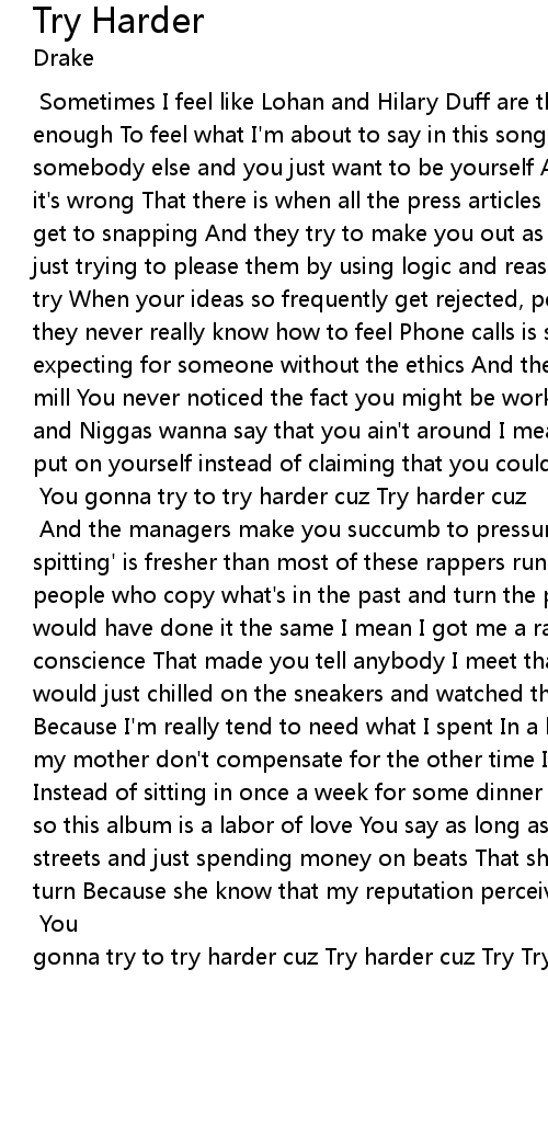 [Verse 1:] Sometimes I feel like Lohan and Hilary Duff are the only ones with enough To feel what I'm about to say in this song When they want you to be like somebody else and you just want to be yourself And you do it and get the feeling it's wrong That there is when all the press articles happening and the cameras get to snapping And they try to make you out as a lie Symbolic because you were just trying to please them by using logic and reason It's a lose lose why even try When your ideas so frequently get rejected, people just get neglected And they never really know how to feel Phone calls is something that you're expecting for someone without the ethics And the motives to try and make them a mill You never noticed the fact you might be working without receiving the perks and Niggas wanna say that you ain't around I mean there's always some blame to put on yourself instead of claiming that you couldn't help and maybe next time you ain't in town [Chorus: (x4)] You gonna try to try harder cuz Try harder cuz Try Try-Try-Try [Verse 2:] And the managers make you succumb to pressure and you spitting' is fresher than most of these rappers running the game Concerned that people who copy what's in the past and turn the profit with cash There's time I would have done it the same I mean I got me a range, Also got me a guilty conscience That made you tell anybody I meet that I rent Sometimes I wish that I would just chilled on the sneakers and watched the game from the bleachers Because I'm really tend to need what I spent In a house that I promised to get my mother don't compensate for the other time I wasted late out at the club Instead of sitting in once a week for some dinner I'm working hard on the winner so this album is a labor of love You say as long as I'm staying out of the streets and just spending money on beats That she can rest without a toss and a turn Because she know that my reputation perceives me and people watch me on TV That's exactly why I often get burned But I'm gonna try to.. [Chorus: (x4)] You gonna try to try harder cuz Try harder cuz Try Try-Try-Try |