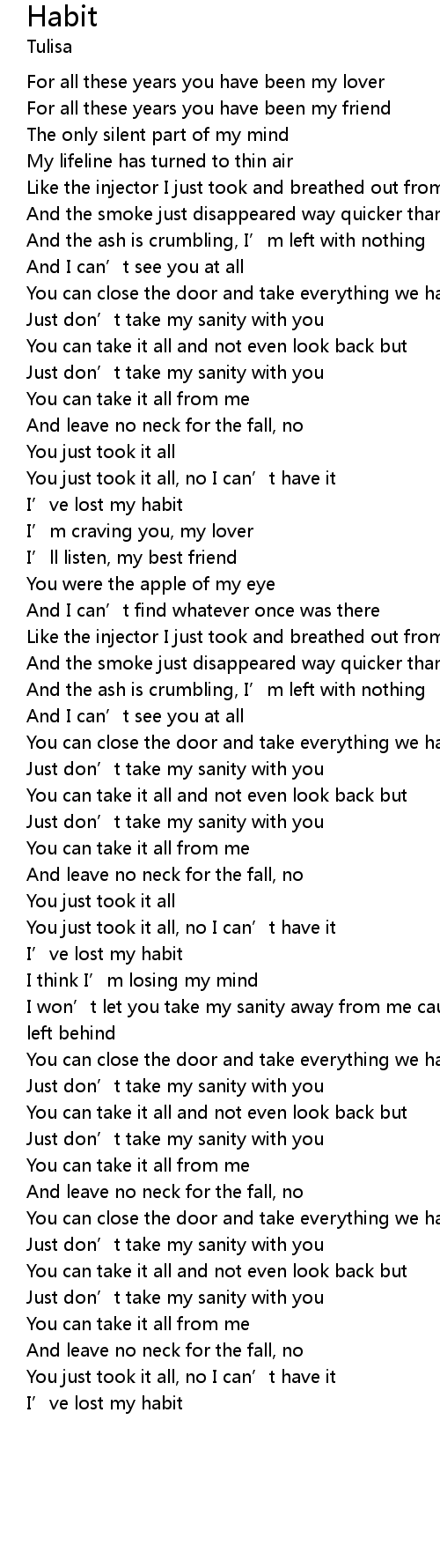 | I won' t let you take my sanity away from me cause it' s the only thing you left behind | |