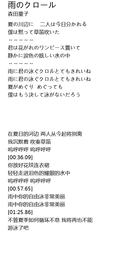 | [00:58.28] | 雨に君の泳ぐクロルとてもきれいね |