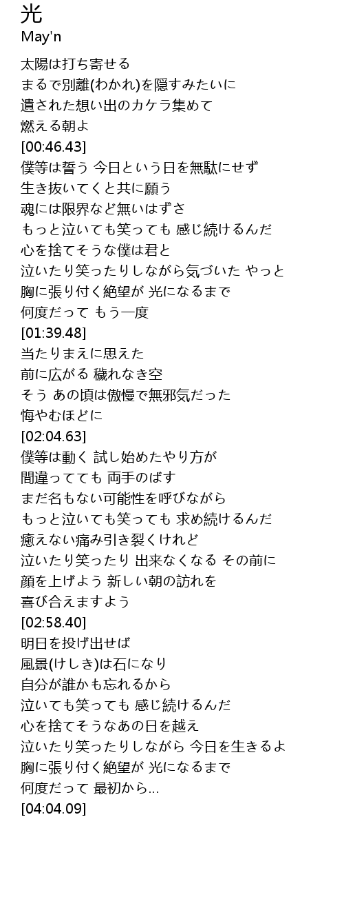 | [03:48.92] | 胸に張り付く絶望が 光になるまで |