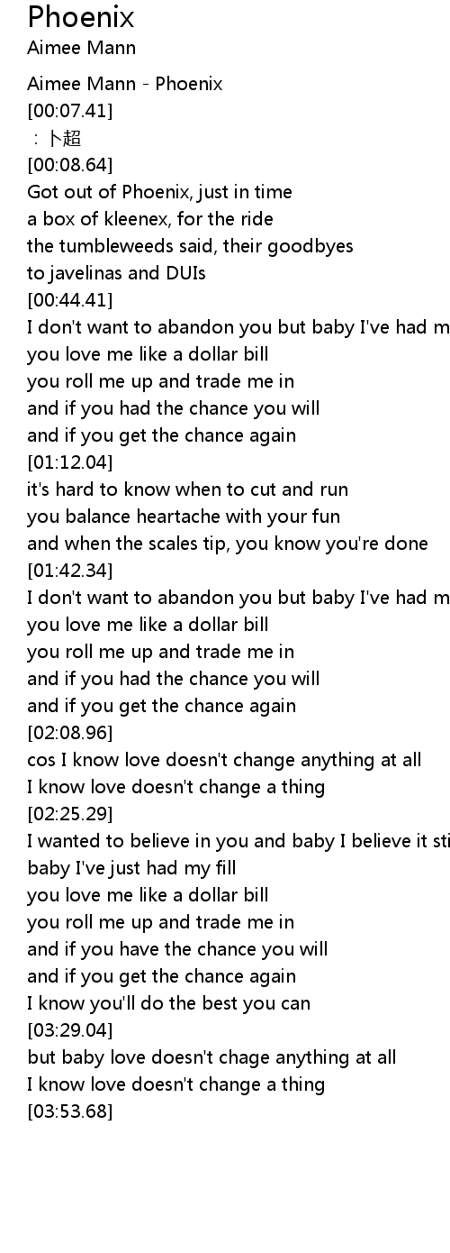 | [01:43.68] | I don' t want to abandon you but baby I' ve had my fill |