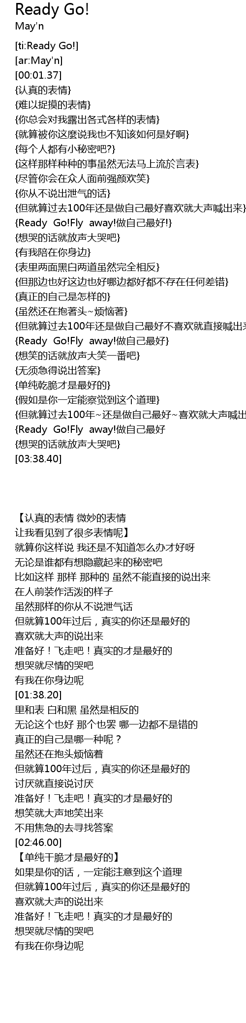 | [03:26.12] | Ready Go! Fly away! zuò zì jǐ zuì hǎo |