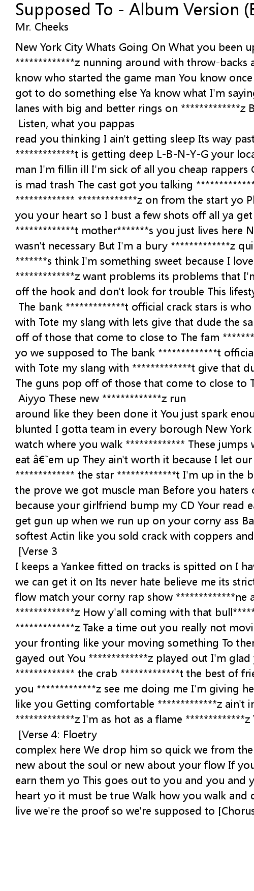 | New York City Whats Going On What you been up too Yeah I know Bunch a z nunning around with throwbacks and fitteds on z know who started the game man You know once z start doin you You got to do something else Ya know what I' m saying Do bigger better things Switch lanes with big and better rings on z Big t em Yeah Aiyyo Verse 1 Listen, what you pappas read you thinking I ain' t getting sleep Its way past the streets no doubt the t is getting deep LBNYG your local heat clappers Pass the pill man I' m fillin ill I' m sick of all you cheap rappers Get the mic up kid yo flow is mad trash The cast got you talking t man ya mad ass I put ya z on from the start yo Plus I am the wizard that gave you your heart so I bust a few shots off all ya get still I run this t mother s you just lives here Never wanted problems it wasn' t necessary But I' m a bury z quick fast in a hurry These s think I' m something sweet because I love the women Ok these z want problems its problems that I' m giving The crack started us off the hook and don' t look for trouble This lifestyle I live it we give it to you double Chorus The bank t official crack stars is who I hang with Tote my slang with lets give that dude the same t The guns pop off of those that come to close to The fam z track you strike back, yo we supposed to The bank t official crack stars is who I hang with Tote my slang with t give that dude the same t The guns pop off of those that come to close to The fam z track you strike back yo we supposed to Verse 2 Aiyyo These new z run around like they been done it You just spark enough ass I' ve been blunted I gotta team in every borough New York Watch how you talk, watch where you walk These jumps wear their steak suits so lets eat em up They ain' t worth it because I let our beat em up the star t I' m up in the bar with Cast a hustle of the prove we got muscle man Before you haters out there that can' t see me Mad because your girlfriend bump my CD Your read easy live with your corny stash Or get gun up when we run up on your corny ass Back up off us you the softest Actin like you sold crack with coppers and officers Flash back shelltoe thick strings and jewelery RIP to FreakyTah Mike and CoolyB Chorus Verse 3 I keeps a Yankee fitted on tracks is spitted on I have no problems showing mine we can get it on Its never hate believe me its strictly fact yo Your corny rap flow match your corny rap show ne ahead z time to get z How y' all coming with that bull t you spit z Take a time out you really not moving nothing Killing me with your fronting like your moving something To them so called friends of mine that gayed out You z played out I' m glad you z stayed out the crab t the best of friends is living well I know you z see me doing me I' m giving hell Pass the mic crew never did like you Getting comfortable z ain' t invite you You lame z I' m as hot as a flame z You know why I' m in this game z Chorus Verse 4: Floetry This cowards walking with a complex here We drop him so quick we from the crib to the film set Ain' t nothing new about the soul or new about your flow If you want your stripes you got to earn them yo This goes out to you and you and you And if you feel it in your heart yo it must be true Walk how you walk and do what you do Live while you live we' re the proof so we' re supposed to Chorus |