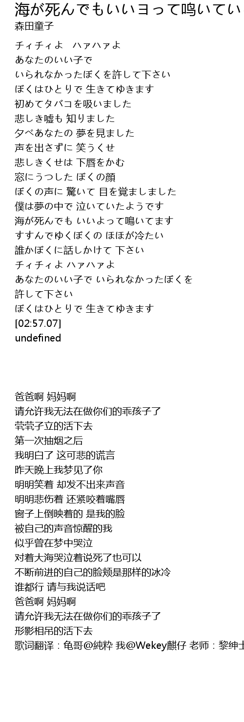 | [01:54.56] | 海が死んでも いいよって鳴いてます |