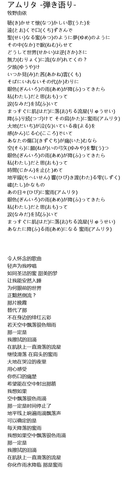 | [03:52.550] | あなたに降(ふ)る雨(あめ)になる 蜜雨(アムリタ) |