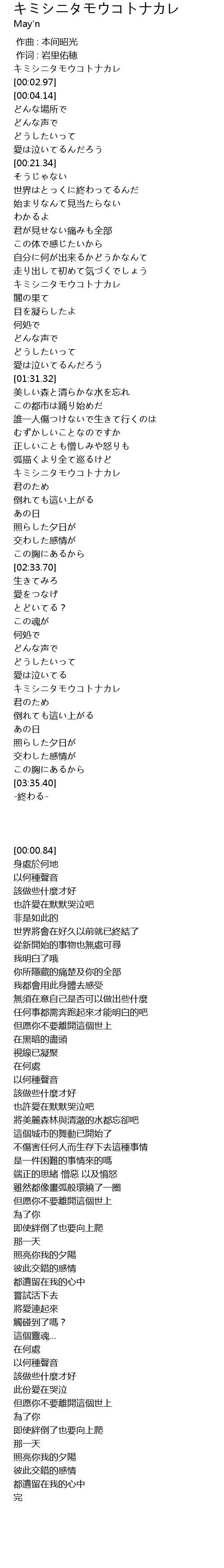 | [03:07.29] | キミシニタモウコトナカレ |
