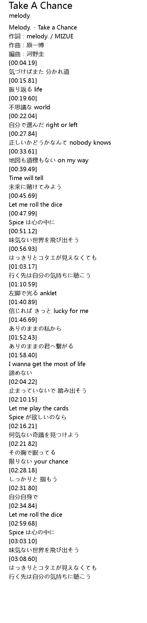 | [00:00.31] | Melody. Take a Chance |